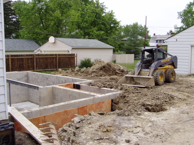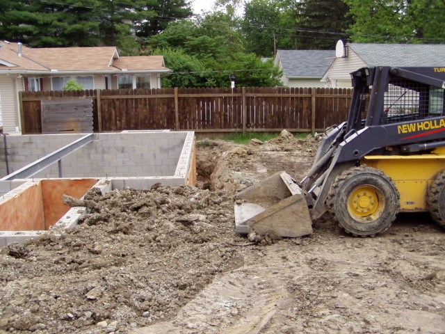 May 28...there is some activity. Some of the backfill is being moved into place around the new basement walls... |